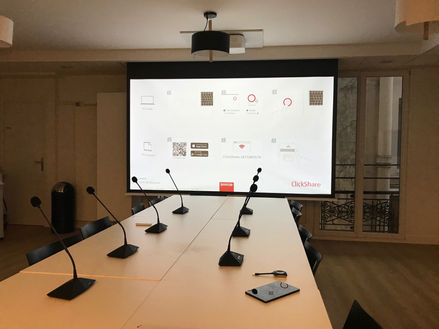 Les signaux audios provenant des microphones de conférence sont restitués vers des enceintes de sonorisation murales. Le son des intervenants est clair et net. Lors des présentations powerpoint et multimédia, le client peut envoyer directement leurs contenus de leur ordinateur vers l’écran de vidéoprojecteur en appuyant sur un seul bouton. Compte tenu des contraintes du couplage de salles, un vidéoprojecteur courte focale fixé avec un support sur-mesure a été décidé.